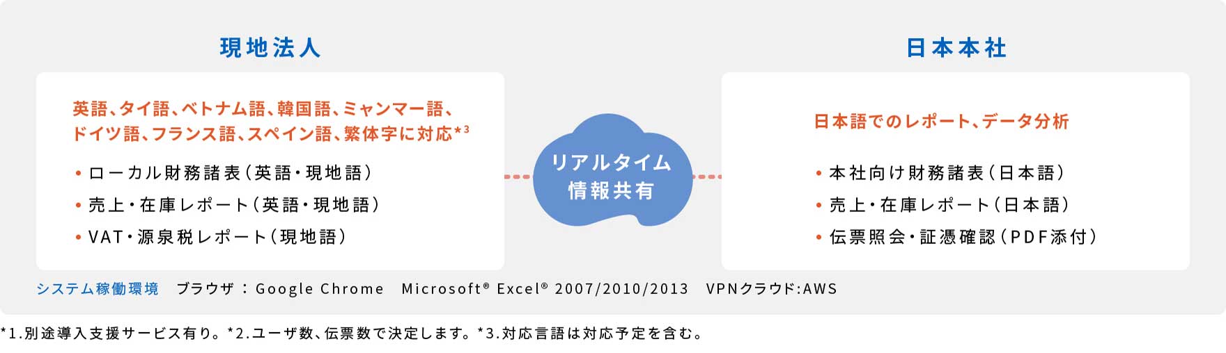 現地法人は現地の言語、通貨、現地勘定科目で記帳、会計業務を行い、日本本社からは現地会計情報を日本語、日本円、本社勘定科目で確認できます。