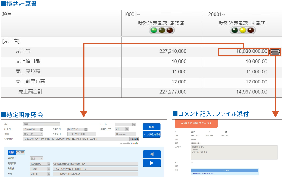 財務諸表の一覧表示、伝票明細へのドリルダウン機能を搭載しています。また、説明コメントの記入やPDFなどの各種ファイルの添付が可能です。これにより、本社報告業務や内部監査などの効率化が実現できます。